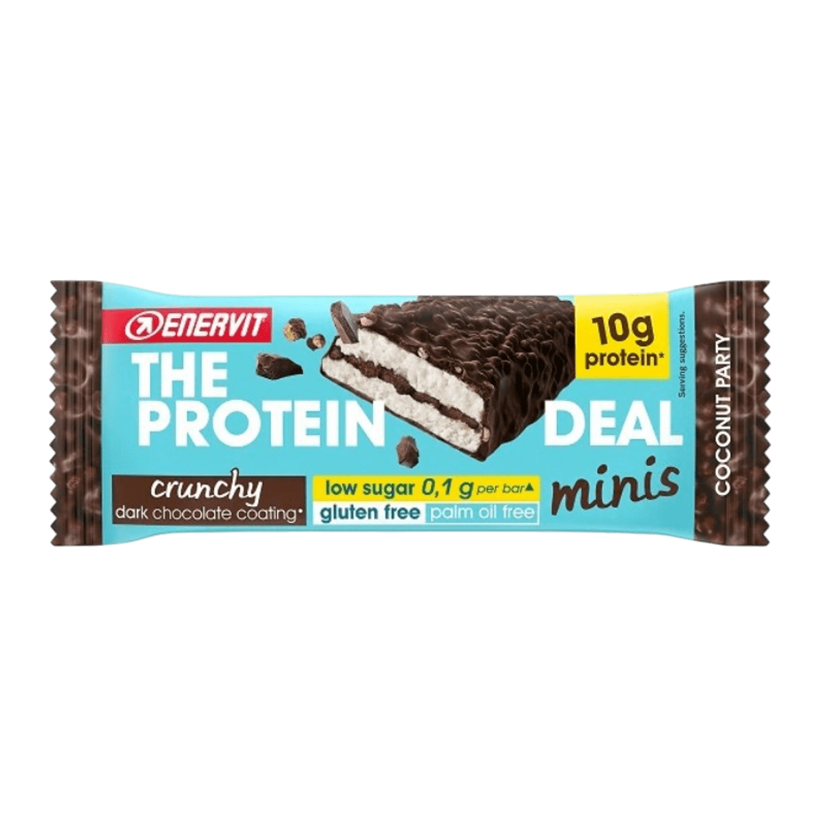 Sestavine: temna čokolada s sladili (33%) (kakavova pasta, sladilo: maltitol; kakavovo maslo, emulgator: sojin lecitin; naravna aroma vanilije), mlečne beljakovine (29%), sladilo: maltitol, kakavovo maslo, sojini kosmiči s kakavom (5%) (izolat sojinih beljakovin, alkaliziran kakav, tapiokin škrob), sredstvo za ohranjanje vlage: glicerol; sladilo: sorbitol, kosmiči mlečnih beljakovin (1,5%), kokosovi kosmiči (1,1%), emulgator: lecitin, naravna aroma. Lahko vsebuje sledi oreščkov, arašidov, sezamovega semena. Brez glutena.